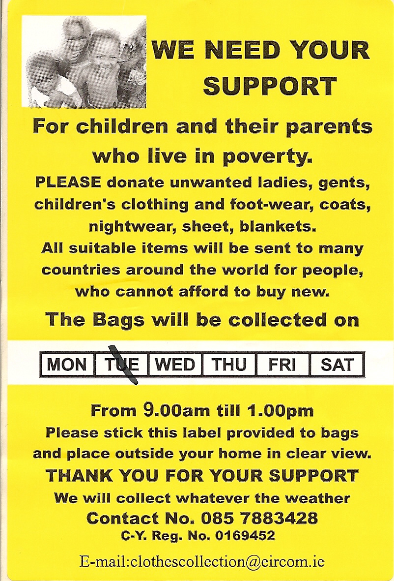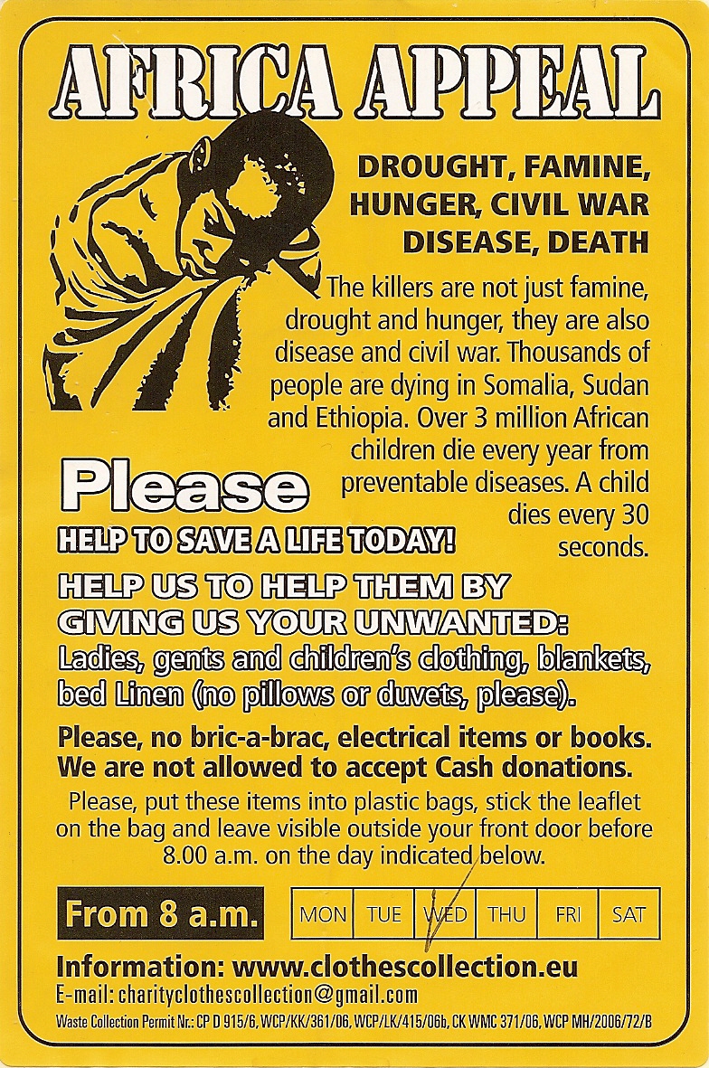 Arriving just two days after Christmas of last year, an ‘African Appeal’ clothing collection sticker arrived, which listed exactly what they wanted, namely clothing, in addition to what they didn’t. Listing a number of waste collection permits as well as contact information, they spoke of wanting to save lives.